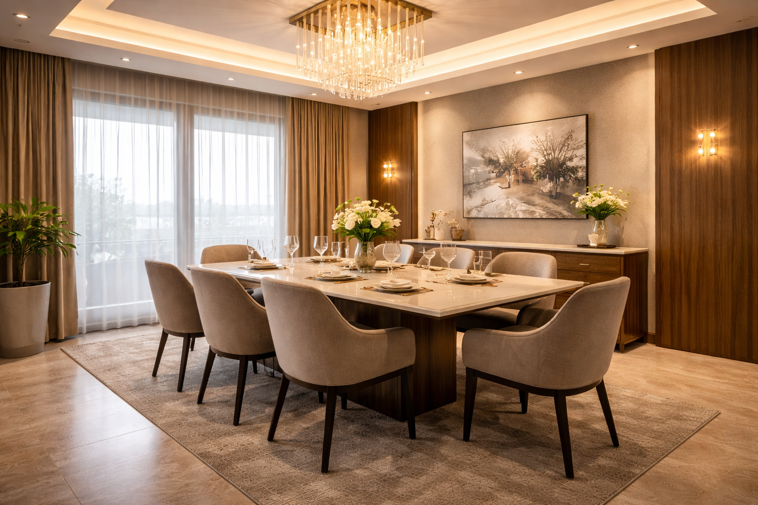 Our dining room designs focus on balanced layouts, comfortable seating, and ambient lighting to create a pleasant dining experience. From dining table placement and lighting selection to wall treatments and décor elements, every detail is carefully planned to enhance both functionality and visual appeal.